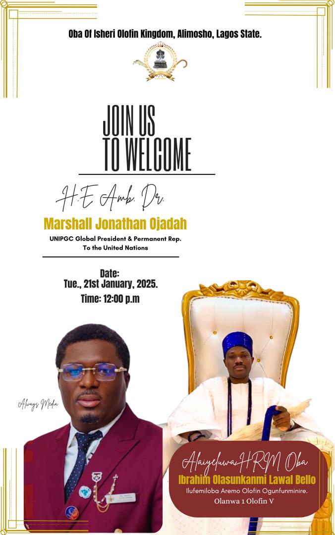UNIPGC Global President & Permanent Representative to the United Nations, His Excellency, Amb. Dr Jonathan Ojadah sets to pay Courtesy visit to newly installed King Of Isheri Olofin Kingdom, His Roya